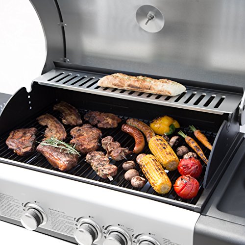 Bruzzzler Edelstahl 4+1 Gasgrill mit Thermometer, 4 Brenner Einheiten + Seitenkocher / 14KW Nennleistung, silber / schwarz