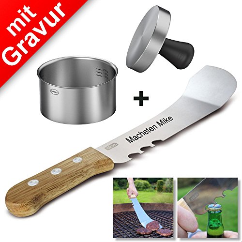 Burger-Grillset: RÖSLE Burgerpresse PRO + Mags Grillmachete MIT GRAVUR (z.B. Namen) aus Edelstahl – Geschenke für Männer // Burger-Grill-Set bestehend aus Burgerpresse + Grillmachete mit Gravur // Burgerpresse 25083: Burgerpresse aus Edelstahl bestehend aus Stempel und Ring; Ringdurchmesser 11 cm passend für normale und große Brötchen (Buns); Ringhöhe 6 cm für Burger-Patties von 100g – 350g; Einfaches Formen der Patties und leichte Entnahme; Einfache Reinigung in der Spülmaschine // Grillmachete 13400: Am Grill fühlt sich doch jeder Mann wohl. Mit dieser Grillmachete kommt aber erst das richtige Feeling beim Grillen auf wenn sich der Mann durch Rauch und heiße Glut kämpft um leckere Steaks zu servieren. Und sollte er dabei durstig werden benutzt er einfach den integrierten Flaschenöffner welcher in dreifacher Ausführung an der Unterseite angebracht ist und die Zacken simulieren. Sehr hochwertige Ausführung mit Holzgriff und Edelstahlklinge der Machete. Länge: grillgerechte 52 cm. Grillgeschenke Burgergeschenke Hamburger Burger selber machen Grillset Grillbesteck Grillzubehör Grillzange mit hochwertiger Gravur (z.B. Name)