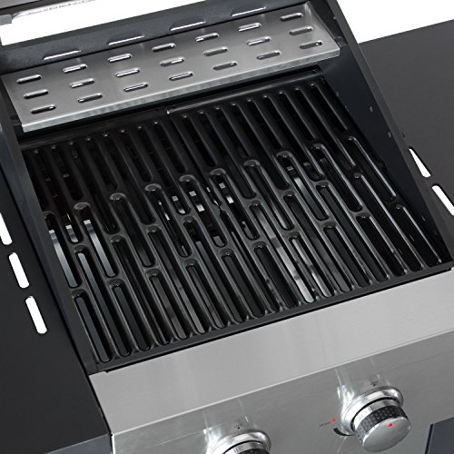 HOCHWERTIG – Der Gasgrill aus Edelstahl ist mit Gusseisen-Grillrost (40x44cm), der für eine gleichmäßige Hitzeverteilung sorgt, ausgestattet. Außerdem ist ein Warmhalterost zur Zwischenlagerung des Grillguts integriert.