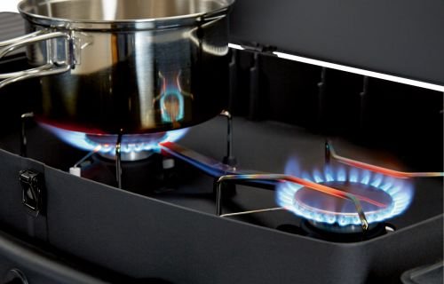 2 getrennt regelbare Edelstahlbrenner (2 x 2,2 kW) für direktes / indirektes Grillen und Backen