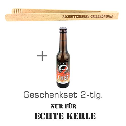 Geschenkset 2-tlg. „Nur für echte Kerle“ mit Bier „Hier grillt der Chef“ und Grillzange mit Spruch „Aschaffenburg´s Grillkönig“/ Geburtstagsgeschenk / kreatives Geschenk / Männer / Grillen