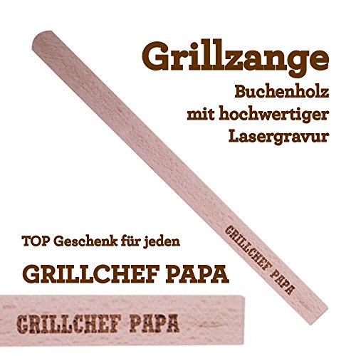 Hier erwerben Sie eine Grillzange aus geleimten Buchenholz mit hochwertigem Gravur-Text: „GRILLCHEF PAPA“. Zum Geburtstag, Vatertag oder als tolles individuelles Geschenk ist diese Grillzange etwas ganz besonderes. Zur Grillzange: 30 cm lang, 2 cm breit, aus Buchenholz geleimt, selbstfedernd. Nicht für die Spülmaschine geeignet! Made in Europe