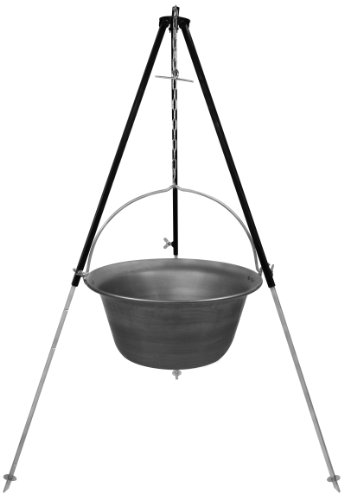 Das Gestell ist für Topfgrössen bis 22 Liter geeignet. Die Höhe lässt sich von ca. 70 – 130 cm variieren. Drei Vierkantprofile lassen sich durch Schrauben in 3 verschiedene Höhen einstellen. An jedem Fuß befindet sich eine Spitze für weiche Böden und ein Einsinkschutz. Das Besondere an diesem Gestell ist folgendes: Zusätzlich zur Höhenverstellbarkeit mit den Teleskopstäben, kann zusätzlich mittels eines Kettenzuges der Gulaschkessel bzw. der Grillrost während des Grillens manuell in der Höhe verstellt werden. Dies ist von erheblichem Vorteil, da eine nachträgliche Höhenveränderung der Teleskopbeine bei aufgebautem Dreibein und Befeuerung unmöglich ist.