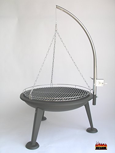 HESANI Schwenkgrill 360-1 mit Kurbel Grill + Feuerschale ein Produkt Daten: Feuerschale 640 mm Durchmesser Höhe bis Feuerschale: 350 mm Gesamthöhe: 1150 mm Grillrost: 50 cm verchromt Grillarm Edelstahl abnehmbar mit Kurbel und Zahnscheibe zur Höhenverstellung:Grill und Lagerfeuer in einem Produkt. Mit diesem Feuerschalenset grillen Sie zuerst für Ihre Gäste, danach legen Sie Holz in die Schale für ein wärmendes Lagerfeuer. Höhenverstellbar und seitlich schwenkbar. Als Zubehör erhältlich: Metalldeckel