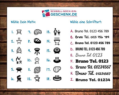 Sie können eine beliebigen Text oder Spruch auf der Grillzange anbringen. Zudem können Sie auch ein Motiv gravieren lassen (falls nicht erwünscht, einfach weglassen oder „kein Motiv“ angeben).