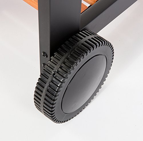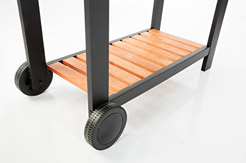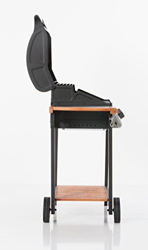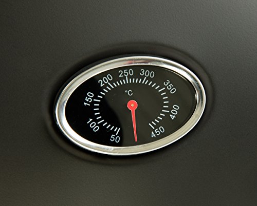 Stabiles Stahlrohrdesign. Transportrollen. 2 Ablageflächen. Thermometer im Deckel. Flammbleche und Fettwanne.
