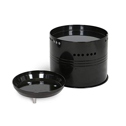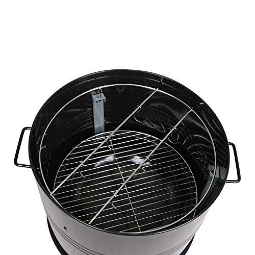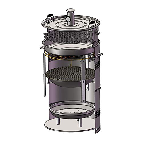 Die Grilltonne ist mit viel Zubehör ausgestattet: mit Feuerschale, mit Wasserschale (beide aus emailliert), mit Grillrost aus Edelstahl und einem Gestell zum hängenden Räuchern