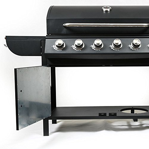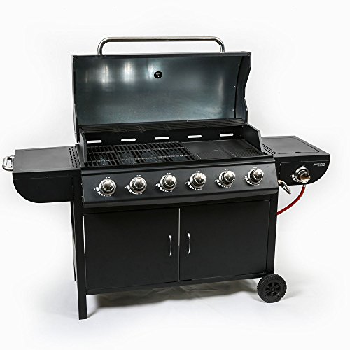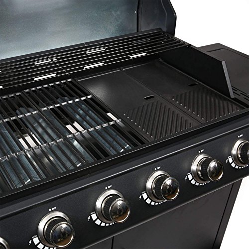 Hochwertiger Gasgrill mit 6 Brennern, 3 emaillierten Gusseisenrosten und 2 Grillplatten, der sowohl durch seine elegante, in schwarz gehaltene Optik wie auch durch seine Leistungsfähigkeit und Grillpower der Extraklasse jeden Grillfan überzeugen wird