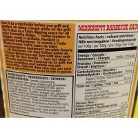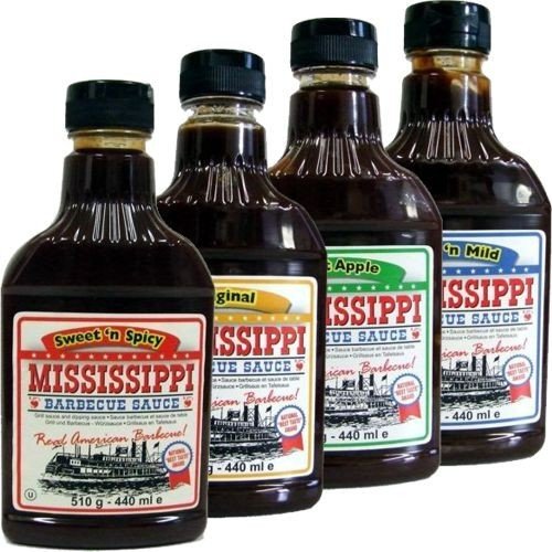Zutaten: Mississippi Barbecue Sauce Original: Tomatenkonzentrat, Fructose-Glucose-Sirup, Branntweinessig, Salz, Zwiebelpulver, Raucharoma, Farbstoff E150D, Gewürze. Mississippi Barbecue Sweet’n Spicy: Tomatenkonzentrat, Fructose-Glucose-Sirup, Branntweinessig, Salz, Zwiebelpulver, Raucharoma, Farbstoff E150D, Gewürze. Mississippi Barbecue Sweet’n Mild: Tomatenkonzentrat, Fructose-Glucose-Sirup, Branntweinessig, Salz, Zwiebelpulver, Raucharoma, Farbstoff E150D, Gewürze. Mississippi Barbecue Sweet Apple: Tomatenkonzentrat, Fructose-Glucose-Sirup, Branntweinessig, Apfelaroma, Salz, Zwiebelpulver, Raucharoma, Farbstoff E150D, Gewürze. Es können Spuren von Allergene enthalten sein (Senf). Die Barbecue Sauce kommt aus de USA.