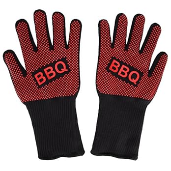 Feuerwehrleute tragen das gleiche Material, das bei diesen Grillhandschuhen verwendet wird. Nomex und Kevlar-Fasern kombiniert verlangsamen den Anstieg der Temperaturen beim Umgang mit heißen Objekten.