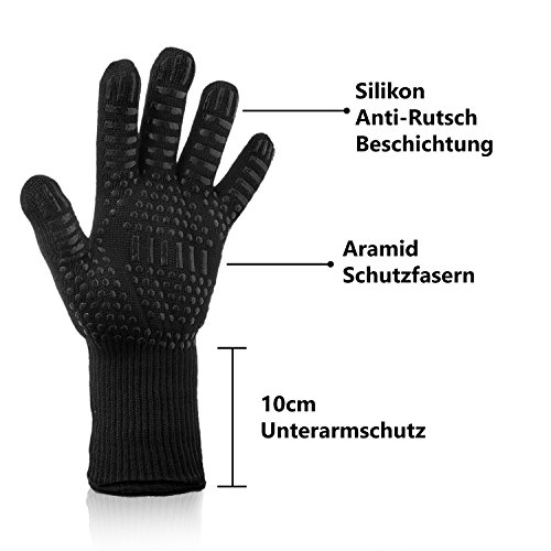 TOP QUALITÄT – Durch die EN407 Beglaubigung und die CE Zertifizierung bekommst du eine hervorragende Qualität die problemlos Temperaturen über 370 °C aushält und kurzzeitig sogar bis 500°C gegen Verbrennungen schützt.