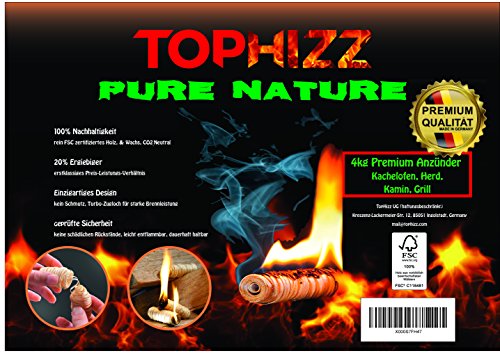 Unsere Made-In-Germany Anzünder werden zu 100% aus Naturrohstoffen (Holzwolle und Naturwachs) per Hand hergestellt. So brennen die Kaminanzünder ganz ohne chemische Zusätze und Geruch und es wird sichergestellt, dass beim Verbrennen keine giftigen Rückstände zurückbleiben.
