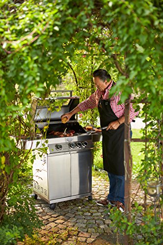 Gehäuse aus Edelstahl, inklusive emaillierter Gussroste und beleuchteter Drehknöpfe; Extra stabile und breite Rollen zum einfachen Bewegen auf der Terrasse oder auf Rasen