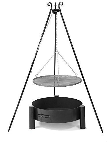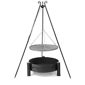 Barbecue auf einem Stativ ist ideal für alle Liebhaber von Outdoor-Erlebnissen. Dieser Grill kann überall, auch auf unebenen Flächen aufgestellt werden. Sein schlichtes und einzigartiges Aussehen wird Ihr Auge bestechen, und gegrillte Gerichte werden den Gaumen der vielen Gäste begeistern. Das stabile 3-Bein des Schwenkgrills besteht aus Stahl, ist ca. 185 cm hoch und auch auf unebenem Untergrund einsetzbar. Mittels einer Umlenkrolle und einer Kette ist der Grillrost in der Höhe verstellbar. Ob Lagerfeuer oder Feuerschale, das Grillgut hat dadurch immer die optimale Hitze.