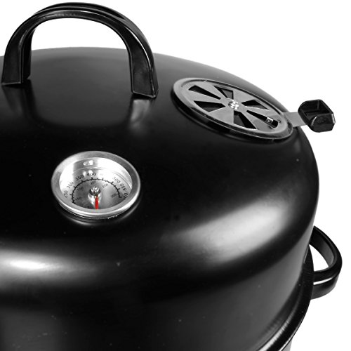 Die 2 Gitterroste bieten ordentlich Platz fürs Grill- und Räuchergut, ein Thermostat am Deckel zeigt die Temperatur an, die Sie durch den Lüftungsregler als auch durch die 2 Feuerklappen gut regulieren können