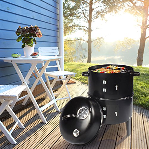 - 2 Etagen-Bauweise mit miteinander fixierbarem Sockel und Mittelteil, sodass Sie in Sekundenschnelle aus dem Räucherofen einen Holzkohle-Grill machen können
