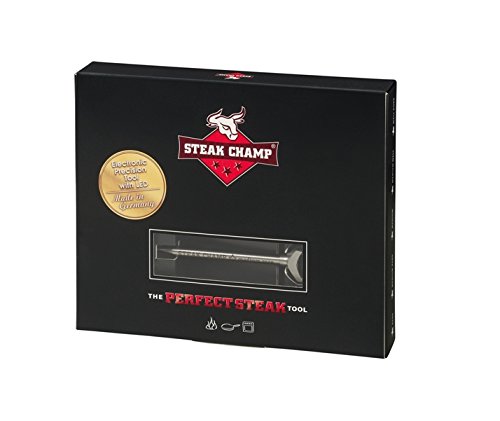 SteakChamp is the ultimate steak thermometer for cooking every steak to just the right point.;Cordless stainless steel probe, compact for use anywhere;Measures core meat temperature along the entire length of the metal probe, not only at the tip.;Color-coded LED flashes when your meat is medium rare;Safe and hygienic high-grade stainless steel. Built-in battery lasts 20 years (minimum 1,000 steaks). Made in Germany.