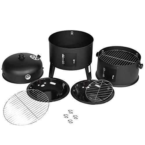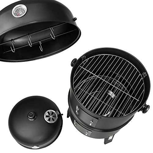 Unser vielseitiger Holzkohlegrill mit 3 verschiedenen Etagen zum Grillen, Garen und Räuchern ist ein Must-Have für alle Grill- und BBQ-Fans. Durch die beiden Gitterroste (Ø 37 cm) hast Du genügend Platz um Familie, Freunde oder Nachbarn zu begrillen. Ein Thermometer am Deckel zeigt Dir die Temperatur, die sich durch die Türchen an den Seiten und den oberen Abzug gut regulieren lässt. Die integrierte Wasserschale hält die Temperatur konstant niedrig für perfektes Räuchern oder kann zum Dampfgaren von Gemüse verwendet werden. Der schnelle Aufbau und die einfache Bedienung des Holzkohlegrills versprechen großen Grillspaß.