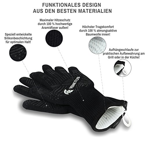 VENETUS-BBQ Grill- und Ofenhandschuhe – setzen neue Maßstäbe im Schutz vor Hitze! Sie gehören in jede Küche: einfache Topflappen oder auch Topfhandschuhe. Genau diese werden jedoch schnell zum Sicherheitsrisiko! Wirklichen Schutz vor Verbrennungen an Händen und Unterarmen bieten dir nur unsere VENETUS-BBQ Hitzehandschuhe! Universell einsetzbar als Grillzubehör u.a. für Dutch Oven, Smoker und Kugelgrill oder auch als Backzubehör u.a. für Pizzastein, Kuchenform und Auflaufform. Deine Vorteile! EN407 zertifiziert: Dauerhafter Schutz bis 350 °C und kurzfristig sogar bis 500 °C